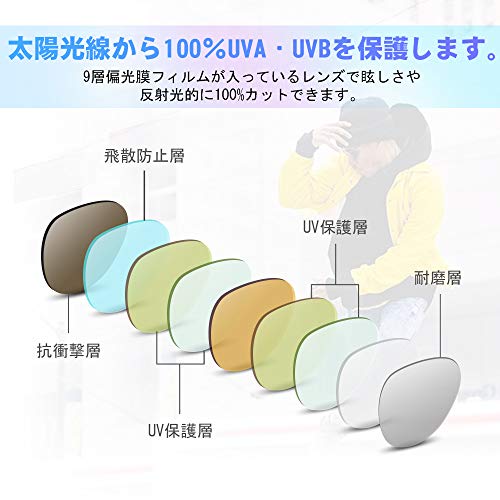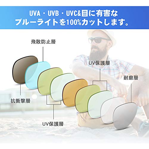 偏光レンズは偏光膜という特殊フィルムが挟み込まれている特殊レンズです。表面に特殊な七つコーティング技術加工しています、1枚目の層は、偏光層です。2、3枚目の層は、耐久性を増すために、層を結合しています。4、5枚目の層は、紫外線を吸収するUV保護層です。6、7枚目の層は、飛散防止層です。UVA・UVB・UVC&目に有害なブルーライトを100%カットします。眩しさや乱反射光を効果的にカットし、より快適な視界を確保することができます。